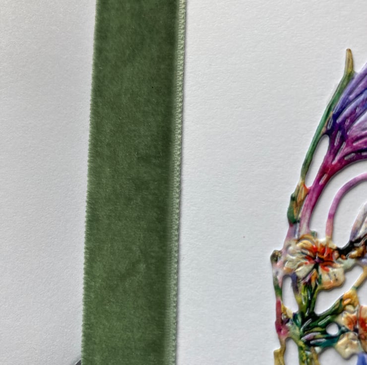 A green velvet ribbon borders the folding edge and the words HAPPY BIRTHDAY are written in purple and green at the top.