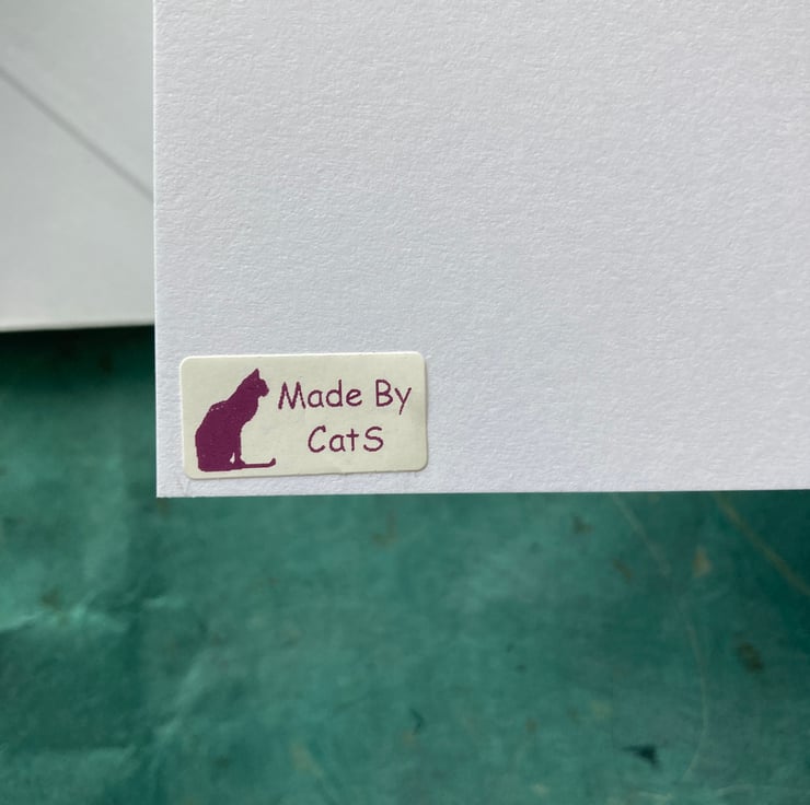 There is a pale green insert and a purple cat logo saying Made by Cats on the back
