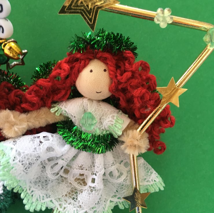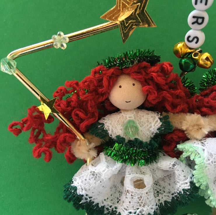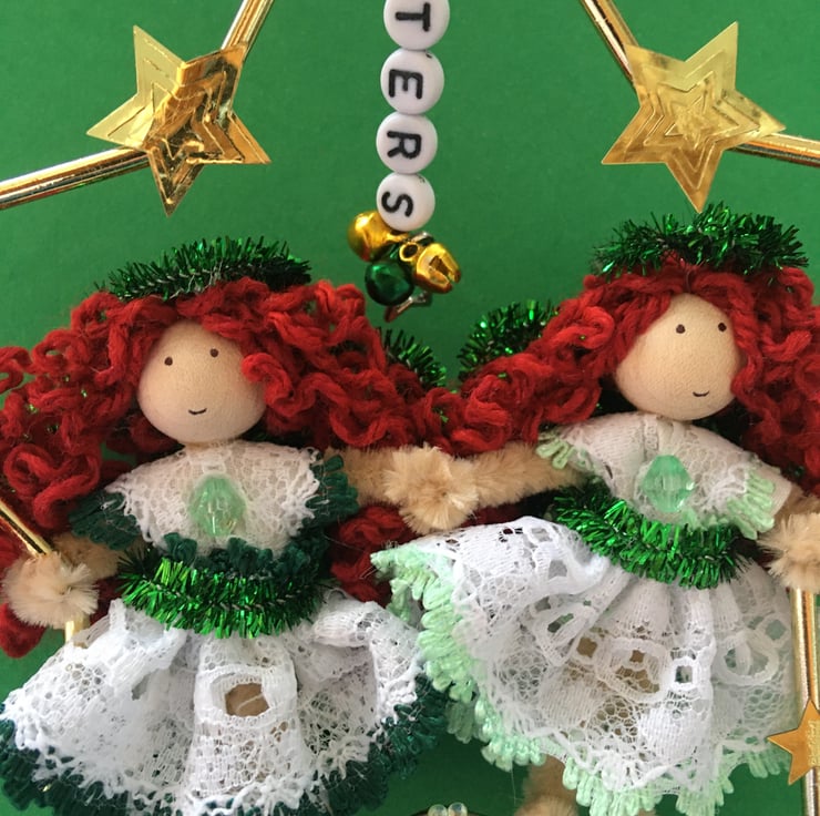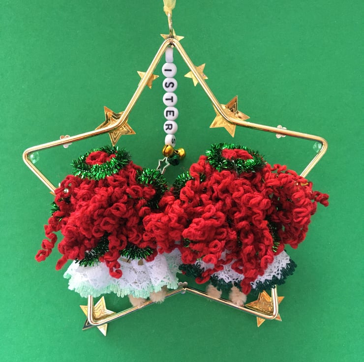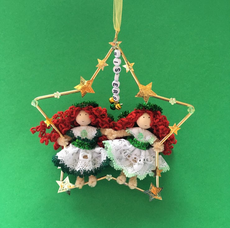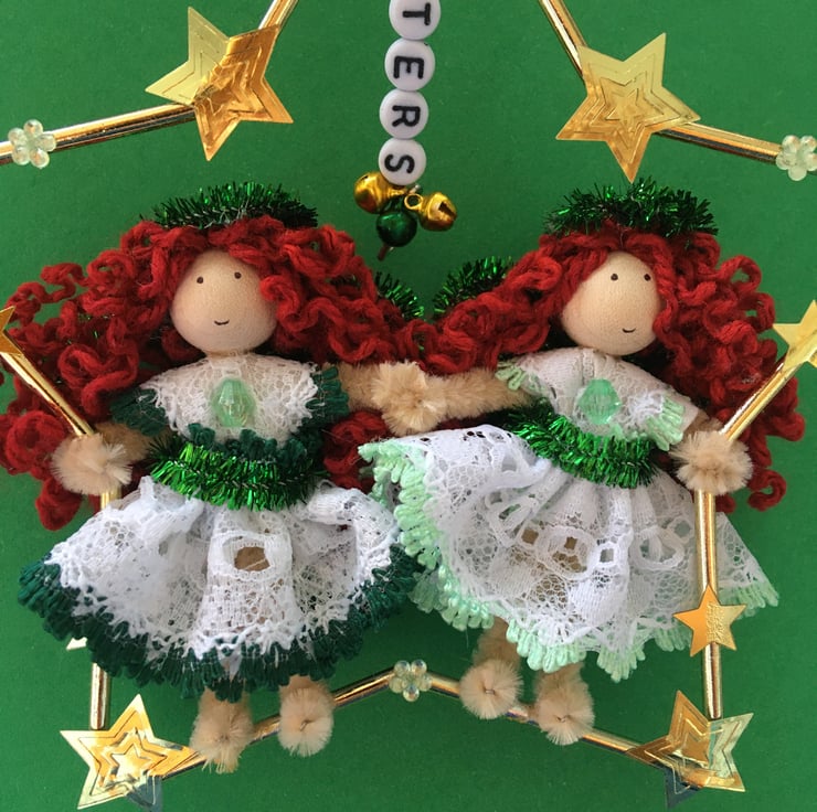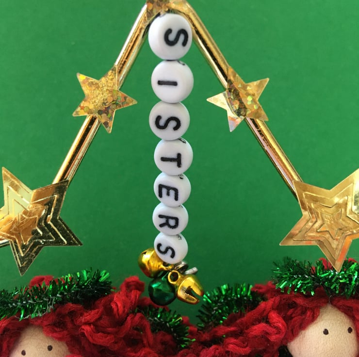 The metal frame star that they are sat in is embellished with gold star sequins, green flower gems and beads, a star charm, and letter beads that say the word 'sisters', and tiny jingly bells.