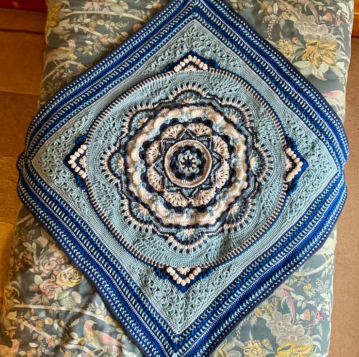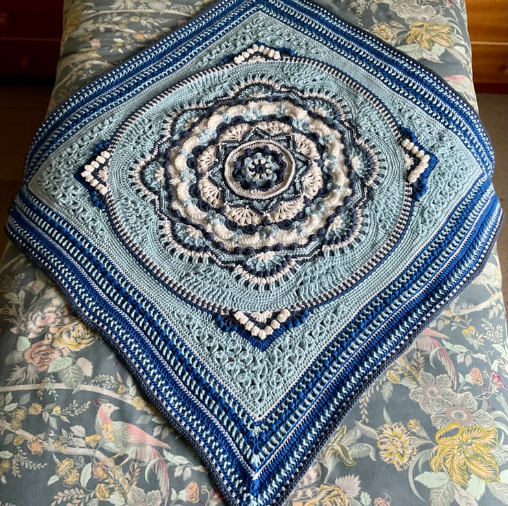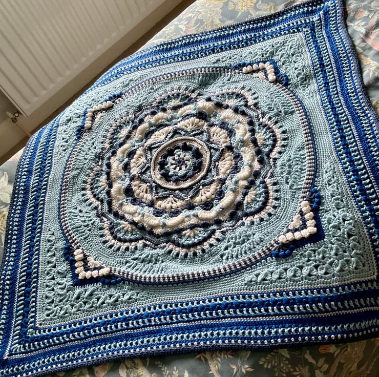 A hand made crocheted baby blanket. This is a beautiful pattern called Baby Arcadia designed by Crystals and Crochet. The pattern is delightful with great stitch definition. It is square with each side measuring 90cms. The yarn is 100% acrylic Deramores anti pilling yarn, now sadly discontinued, it is beautifully soft with an almost silky cotton feel. It has been crocheted with various shades of blue and white.