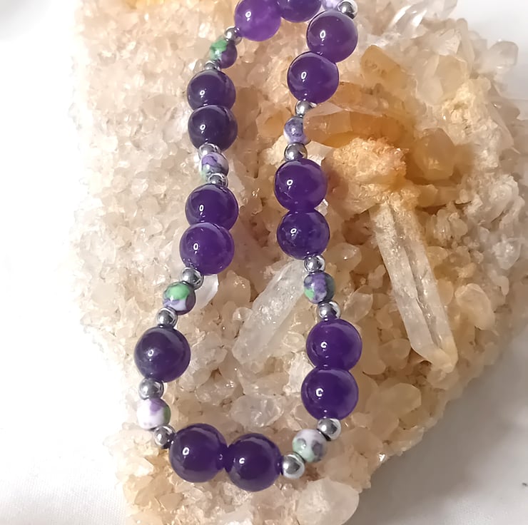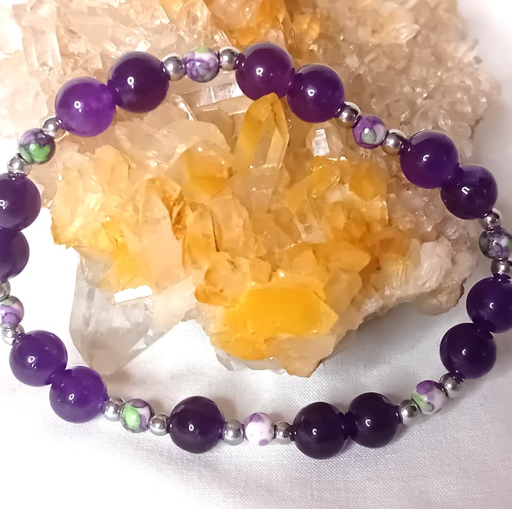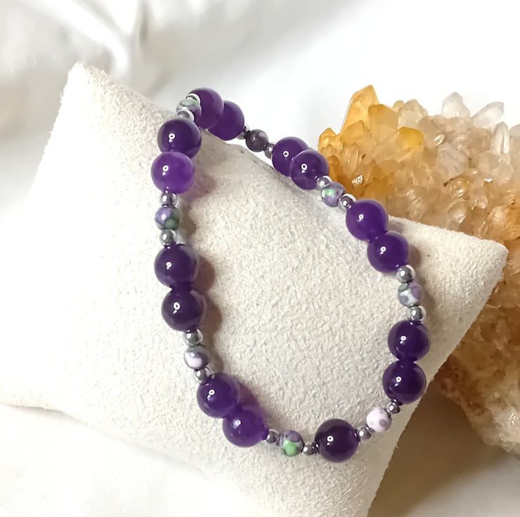 Discover the elegance of this deep purple Amethyst gemstone bracelet measuring 8mm, beautifully paired with Purple Flower Agate at 4mm and Hematite accents measuring 3mm. Designed with a comfortable elastic base, it’s perfect for everyday wear. Available in a range of sizes to suit your preferences—simply select your ideal fit from the drop-down menu.