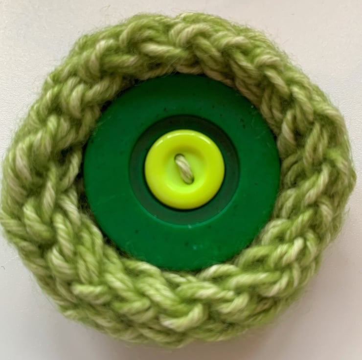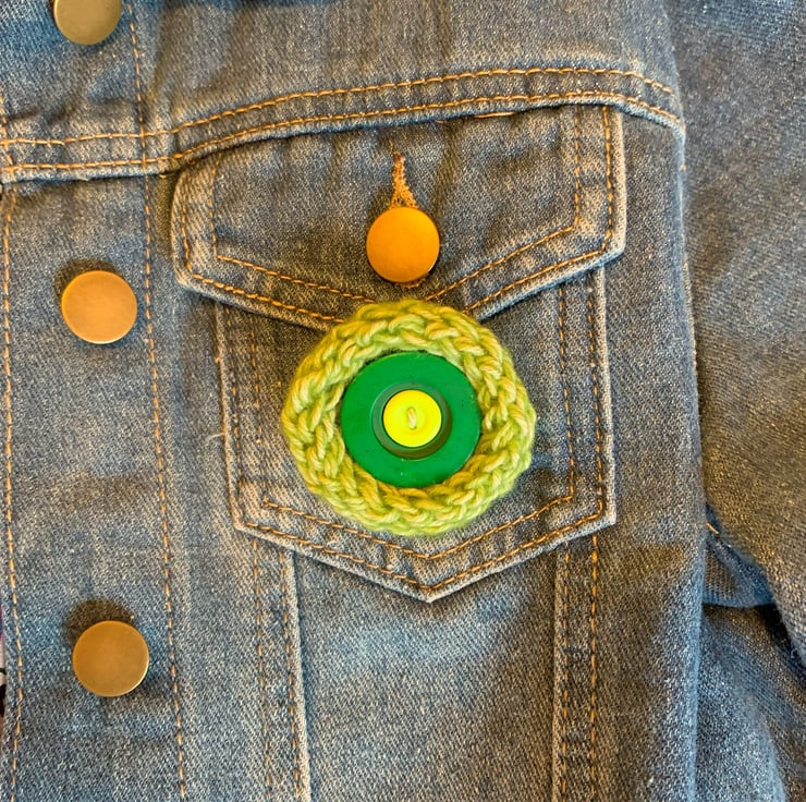 1 x Hand knit Brooch with buttons as centrepieces. Shades of green, perfect for celebrating the coming Spring.