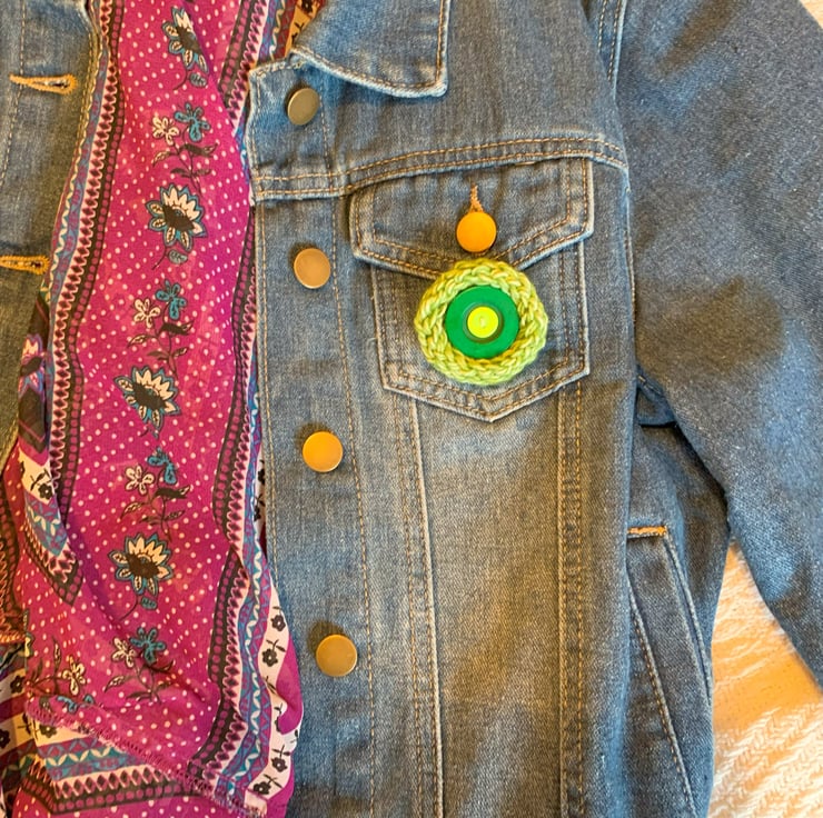 Knitted Button Badge Brooch Green Handmade Pin Repurposed Jewellery