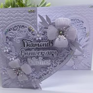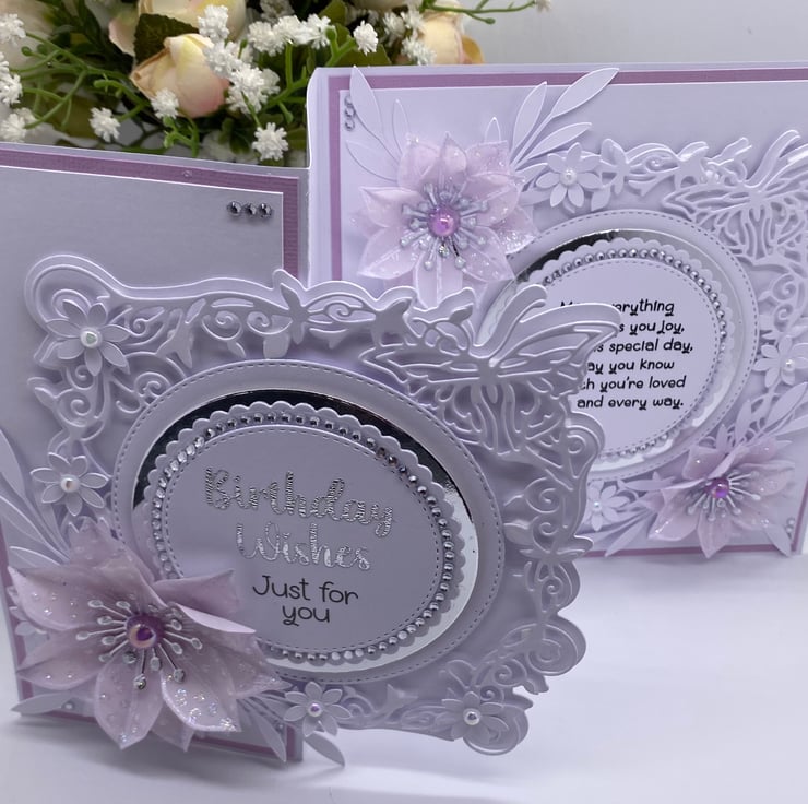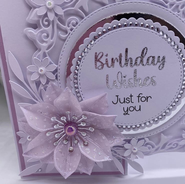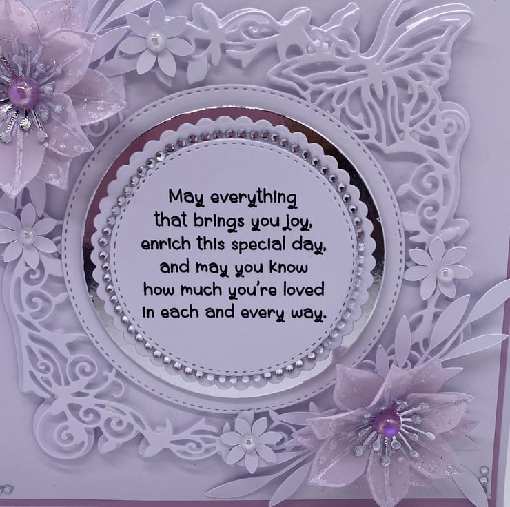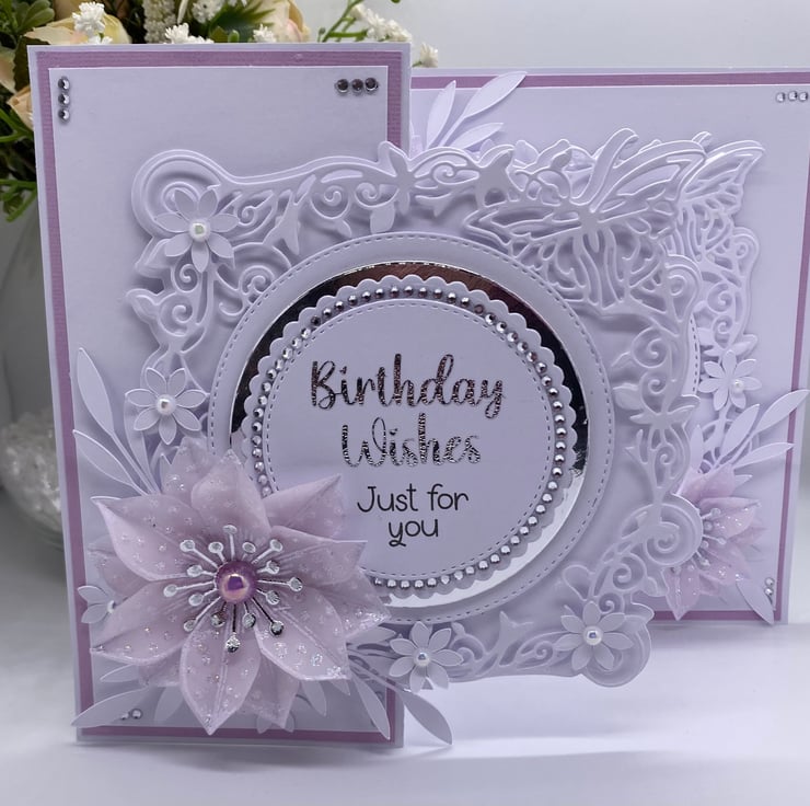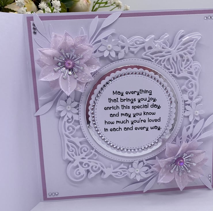 This type of card with the 3D flowers takes time and patience, the vellum inset of the flower has been heat embossed and curled with additional silver centres and finished off with a pearl embellishment.