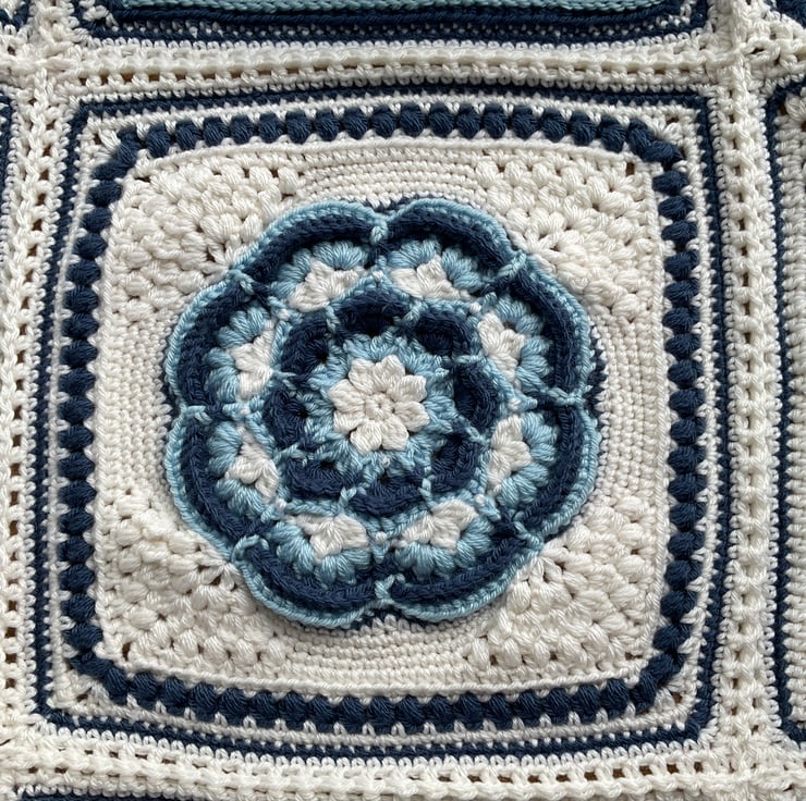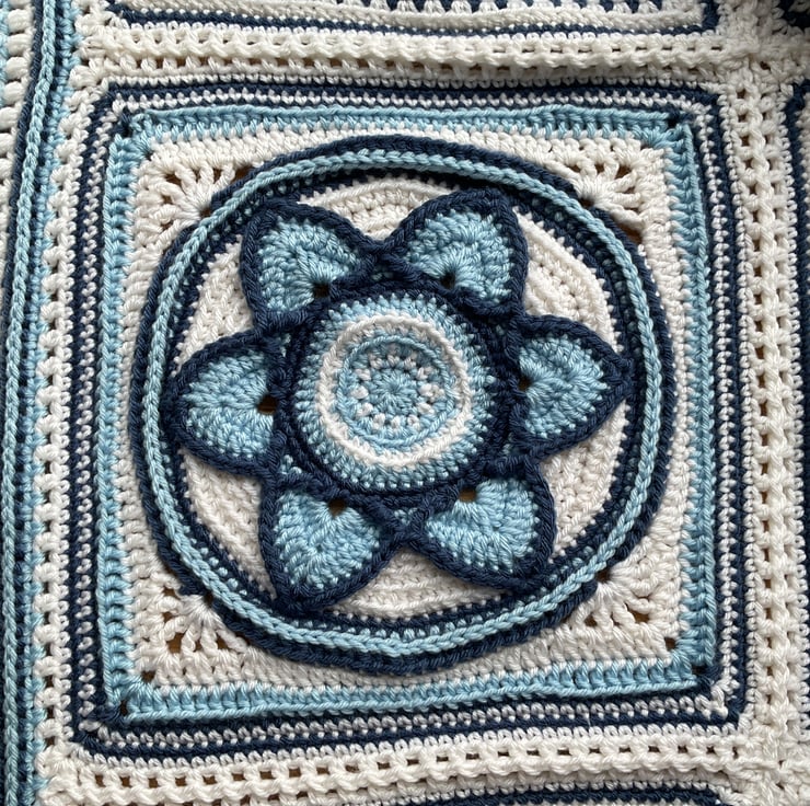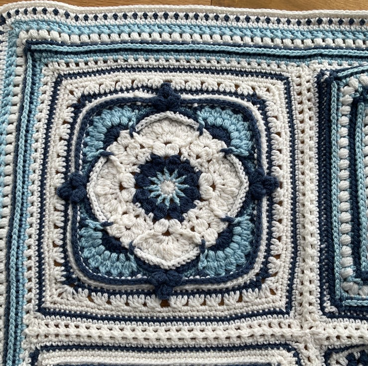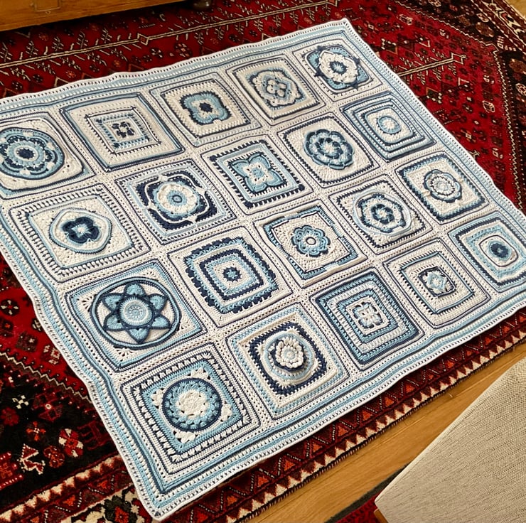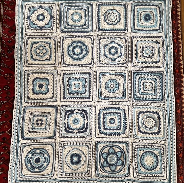 A beautiful blanket made using 20 different square patterns that have been joined and bordered to create a blanket measuring 126cms x186cms and weighing over 1 and 1/2 kg! The yarn is 100% acrylic Deramores anti pilling yarn which has now sadly been discontinued. It had a very soft almost cotton, silky feel. The pattern is a design by Hooked on Sunshine.