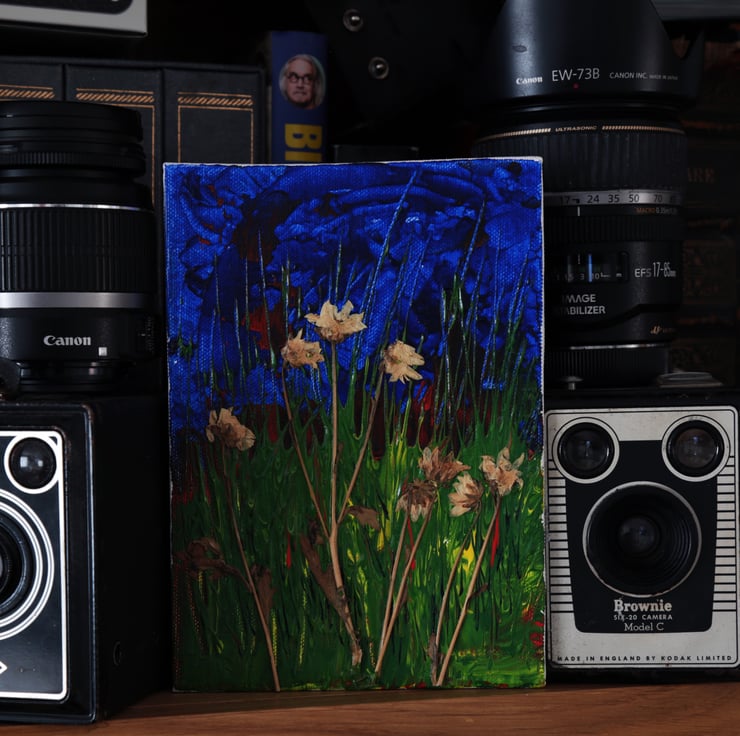 Acrylic paint and dried flowers.