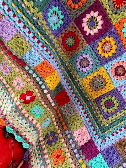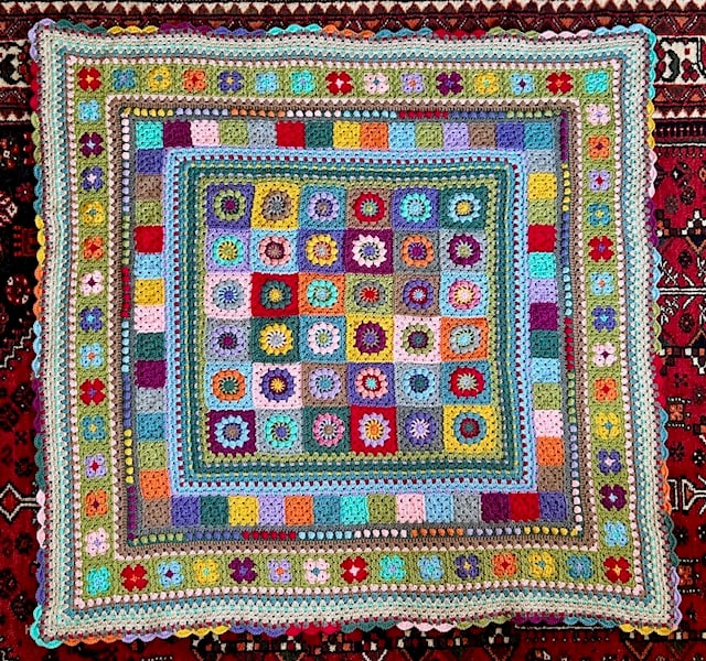 A great granny square blanket designed by WoolThreadPaint. Her colour schemes and square placement create a beautiful blanket that will become an heirloom treasured piece. This has been made using Stylecraft Special DK a 100%acrylic yarn that is machine washable. I recommend using a delicate wash and short spin to avoid stretching the shape. The colours are very vibrant and cheerful. It is square and each side measures 122cms.