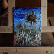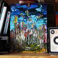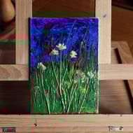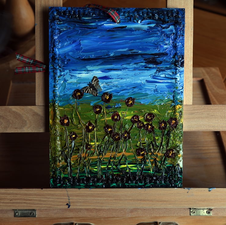 This is my own work, mixed media on 6" x 8" art board with hanging ribbon.