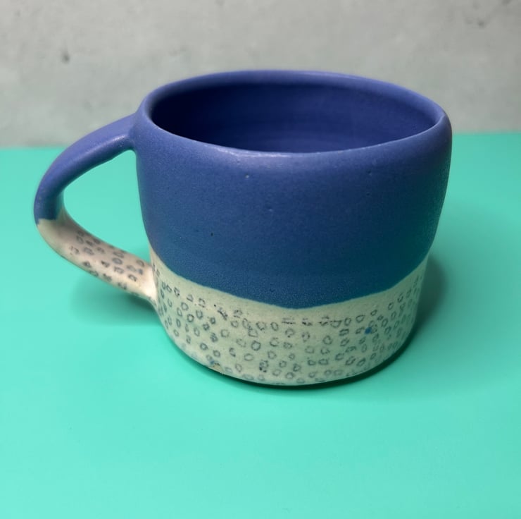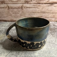 Hand made and decorated mug. Made in Brighton UK. Bright blue with drawn black circles. Holds approximately 200ml.