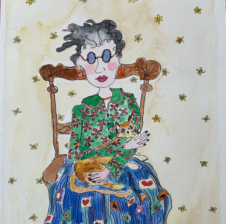 A quirky gift for cat lovers of a striking lady sitting down to pose. Is she an eccentric artist. Is she wearing the blouse as it matches her cats eyes perfectly? Who knows it is left to you to make a story around this mystery lady.