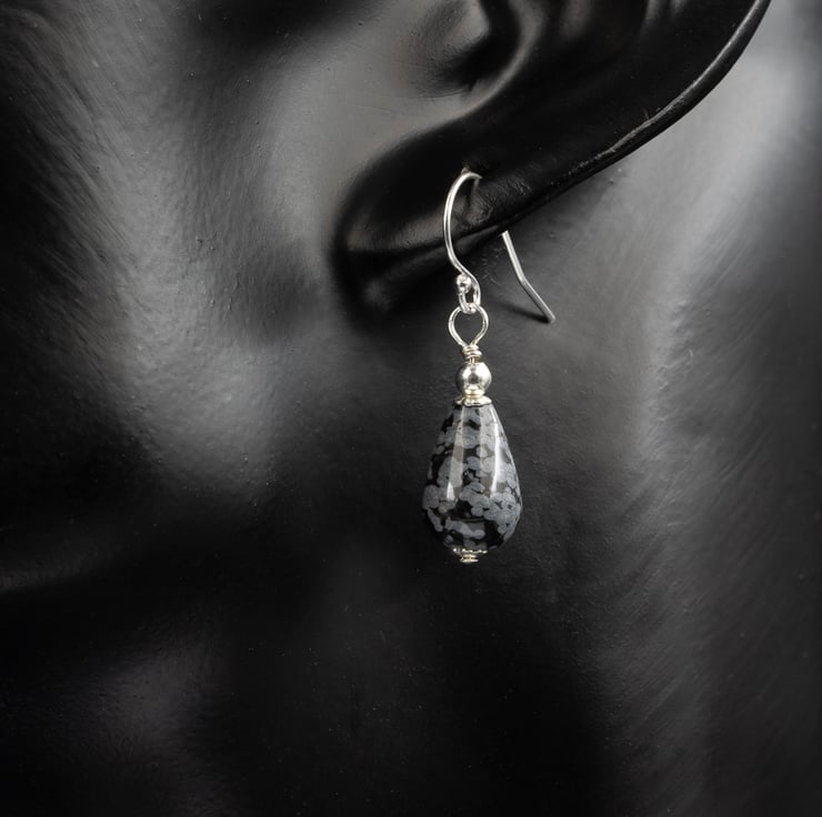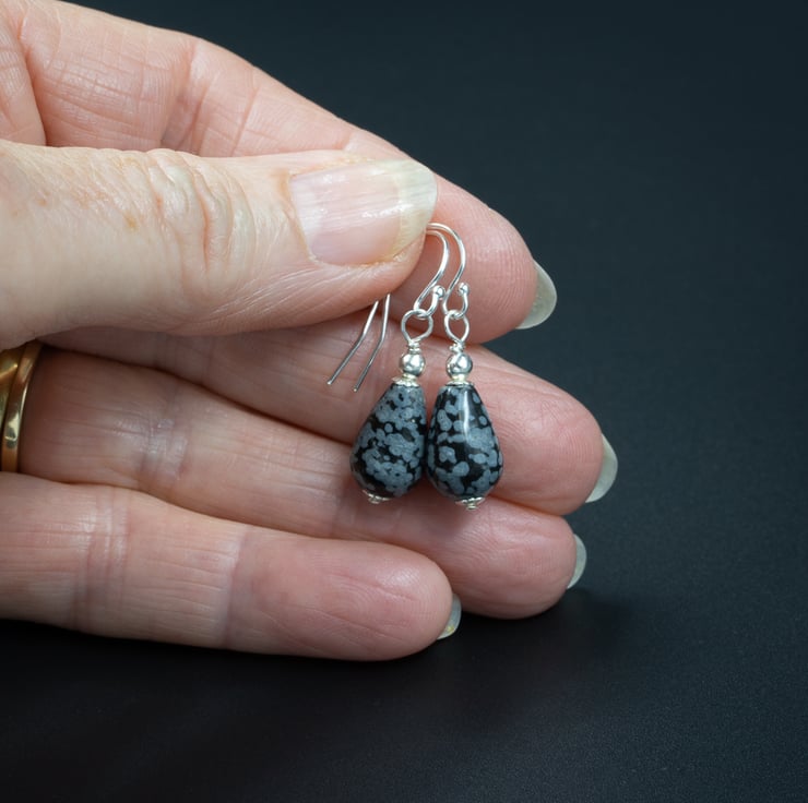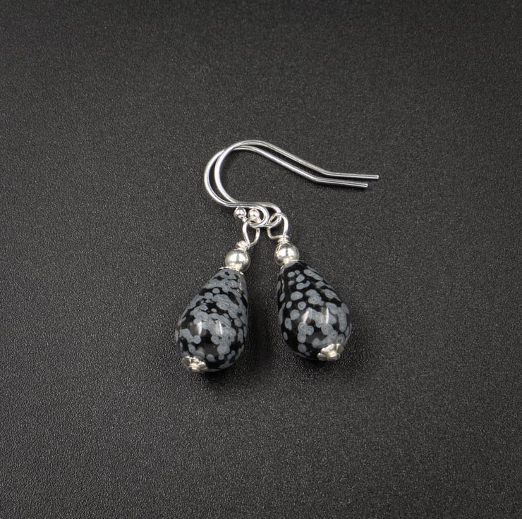 Mottled black and grey natural snowflake obsidian 12 mm / 0.6 inch teardrop stones are topped and tailed with sterling silver bead caps and a tiny sterling silver bead and hang from sterling silver hooks. Simple, classic, feminine drops for all occasions.