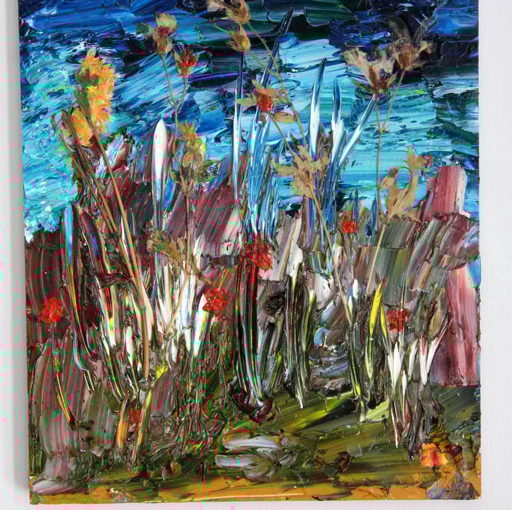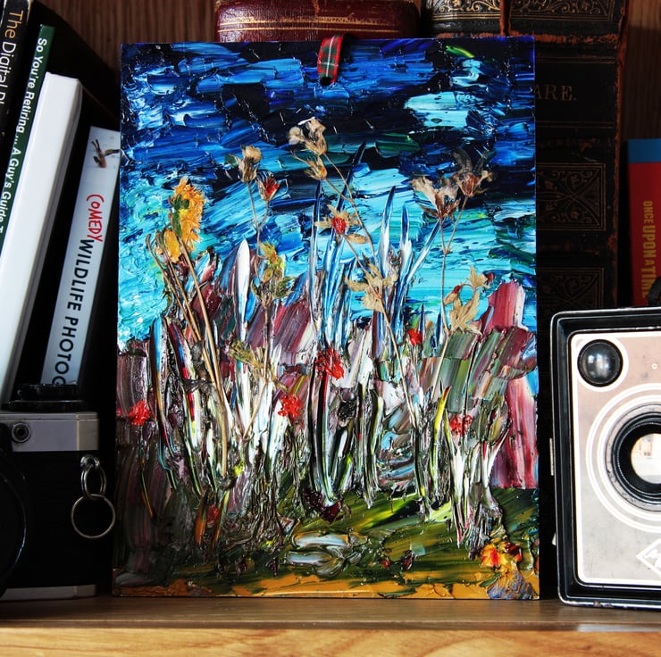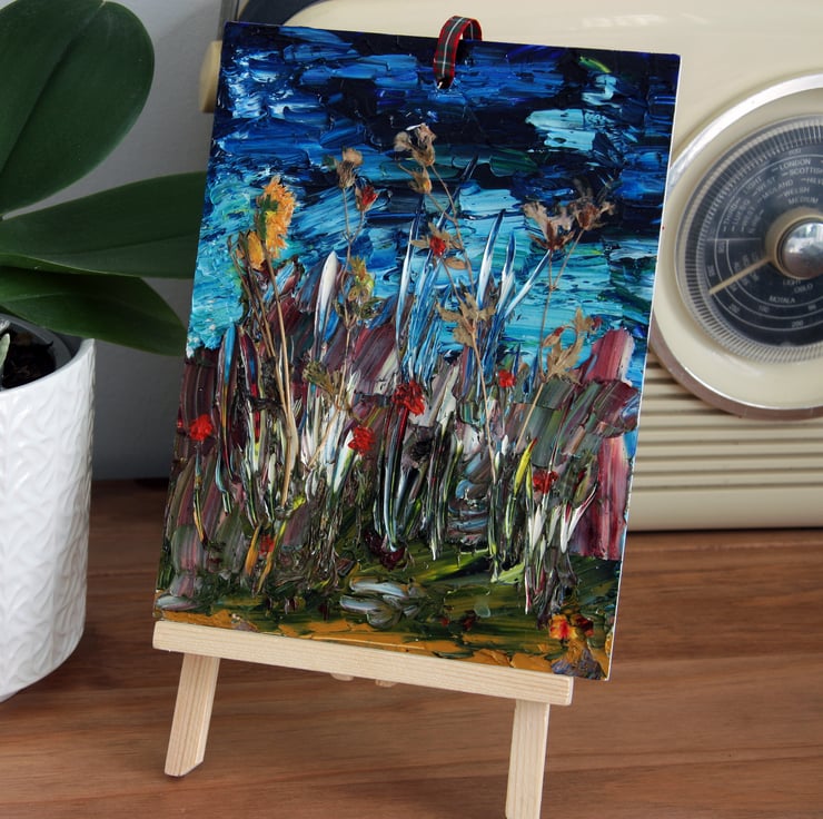 This is my own work, mixed media, oil paint and dried flowers on 6" x 8" art board with hanging ribbon.