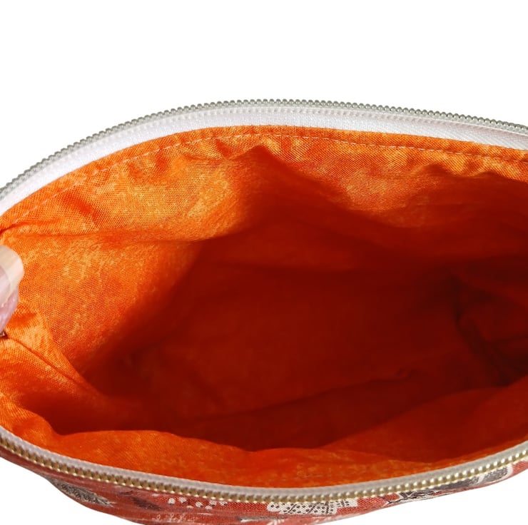 Finished size of bag - 11" across the top - 8" across the bottom - 3.5" deep. It opens with a white zip with contrasting gold teeth and pull.