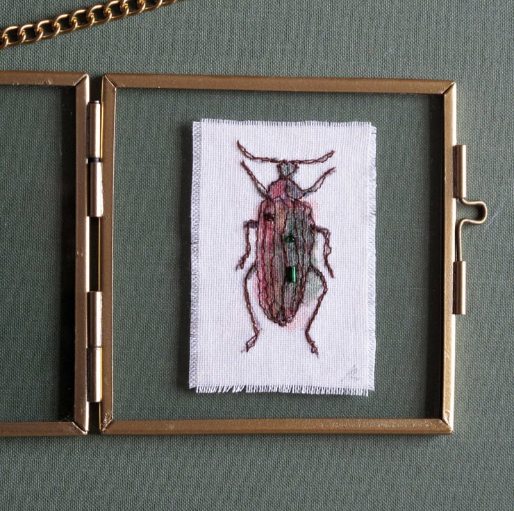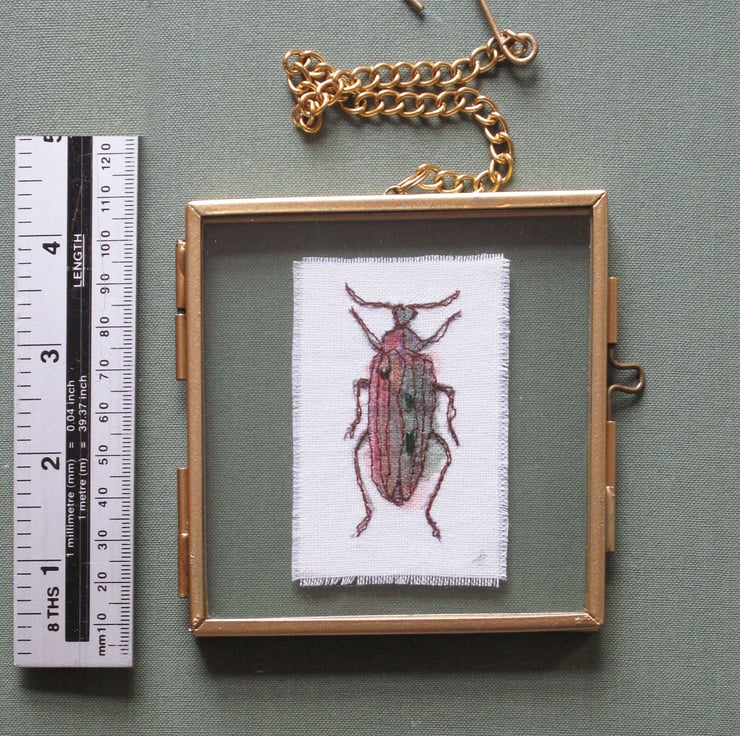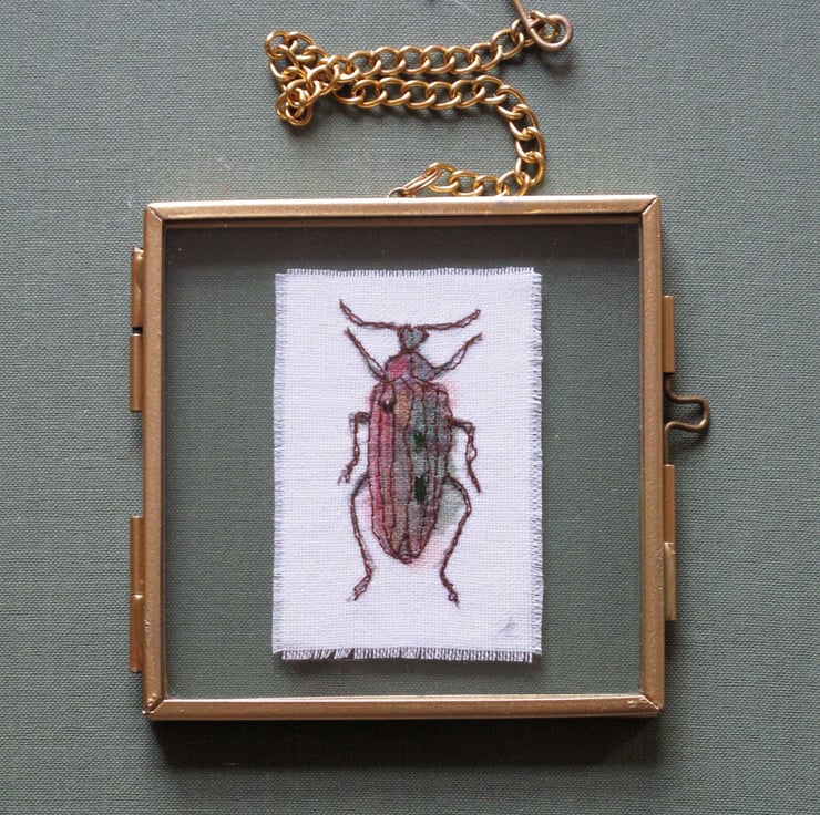 Original art work by Ann Robertson. These beetles are printed on fabric and individually coloured, machine embroidered and decorated with hand sewn beads. They are suspended between glass in metal and glass frames that have a metal chain.