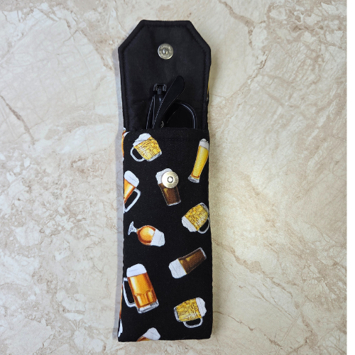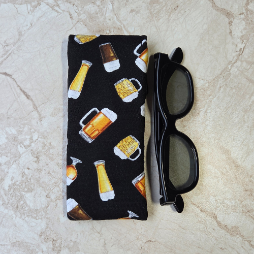 Soft handmade glasses case suitable for both prescription and sunglasses. Made in soft black cotton fabric featuring different beer glasses printed on the outside to make a fun design. Insides have plain black cotton fabric. Compact fleece lines the glasses case which closes on the flap with a magnetic snap.