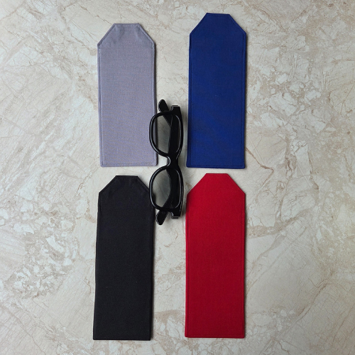 These four glasses cases have been handmade using plain cotton fabric in either red, black, blue, grey. They are lined with thick lining material giving them a stiffish starchlike feel. Can be used for either prescription or sunglasses.