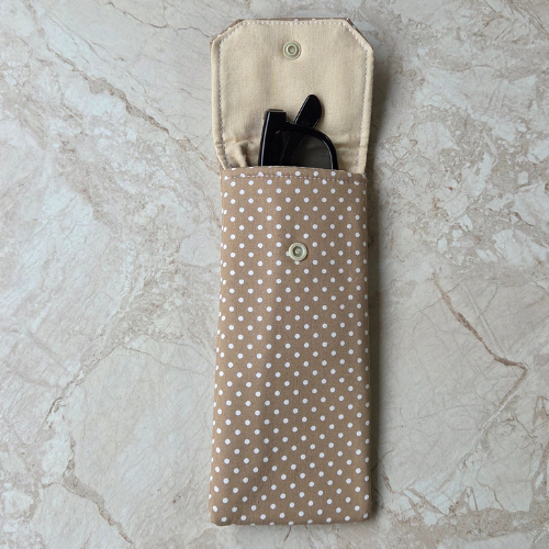 Soft handmade glasses case suitable for both prescription and sunglasses. Made in soft dark beige cotton fabric featuring polka dots printed on the outside to make a fun design. Inside have plain light beige cotton fabric. Foam lines the glasses case which closes on the flap with a plastic popper.