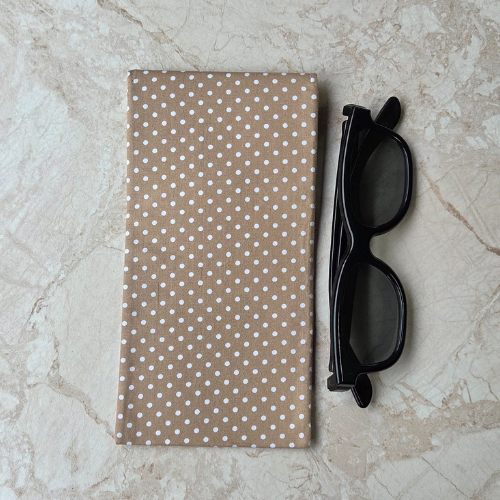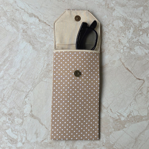 Soft handmade glasses case suitable for sunglasses. Made in soft dark beige cotton fabric featuring polka dots printed on the outside to make a fun design. Inside have plain light beige cotton fabric. Thick stiffish starchlike martial lines the glasses case which closes on the flap with a magnetic snap.