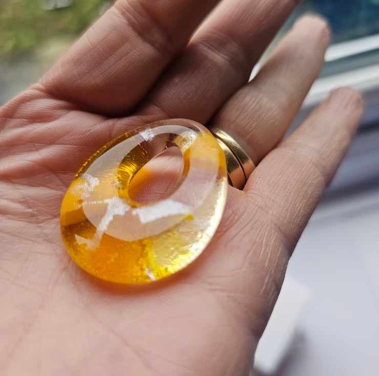A perfect small gift to show someone you care for them. Or beautiful to keep or yourself. Can also be used as a cord pull. Hand cut and kiln fused, a unique item. Very tactile lightly textured underneath and glossy smooth / texture on top. Will arrive wrapped in tissue and in a plain white box tied with ribbon. It can be posted directly to the gift recipient with a printed message of your choice. Approximately 4cm/1.5" long. The gift box is 6cm/2.5" square.. Photo with 3 being worn compares Large, medium and small. Please note outer packaging may be recycled.