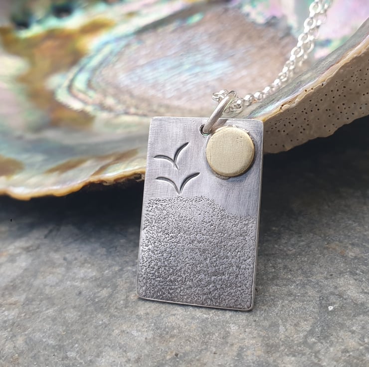A lovely gift for any beach lover. This pendant is handmade in 0.8mm sterling silver which has been textured to represent the sandy beach or sea. It has a brass sun and 2 stamped seagulls flying in the wind. The pendant has been oxidised to give the darker effect and highlight the textures. Measuring approx. 15mm x 22mm, it comes complete with a sterling silver belcher chain which fastens with a bolt clasp.