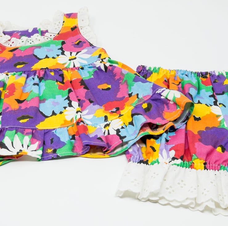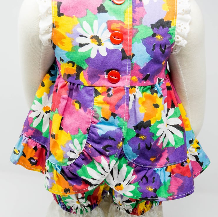 A bright floral dress trimmed with broderie anglaise, a ruffle at the hem and buttoned at the back.