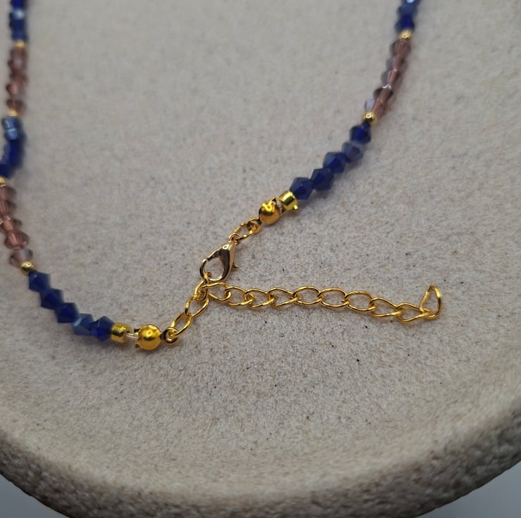 Deep navy and soft lilac beads create a dreamy, twilight inspired palette, each one catching the light with subtle sparkle. Tiny gold spacers add warmth and rhythm throughout the strand, leading to a striking rectangular pendant in glossy ocean blue tones. The pendant’s marbled white and silver detailing gives it a fluid, wave like texture that makes it the natural focal point of the piece. The overall look is bold yet elegant; a handcrafted statement necklace with a serene, moody charm.