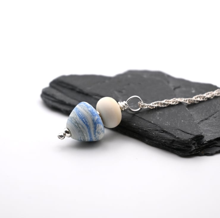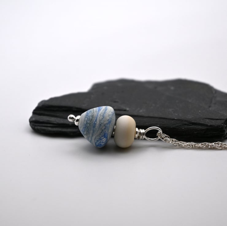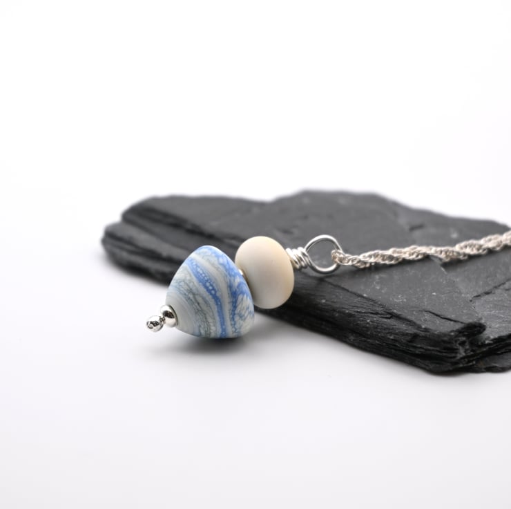 A sterling silver chain which features a handmade lampwork glass pendant.