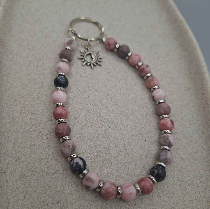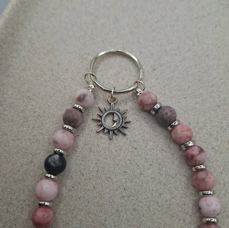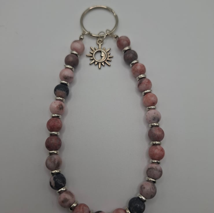 This vibrant beaded keychain blends warm pinks with deep black accents, each bead separated by metallic spacers for a polished finish. A sturdy metal ring holds a charming sun shaped pendant that adds a touch of personality and symbolism; bright, bold, and full of good energy vibes. It’s a colourful, handcrafted accessory perfect for bags, keys, or gifting to someone who loves unique little details.
