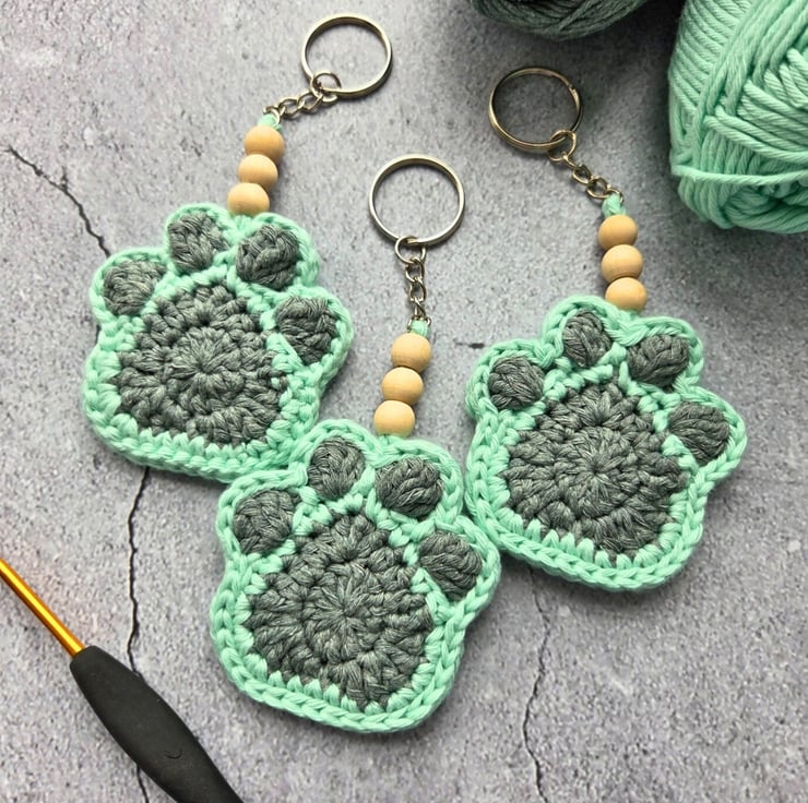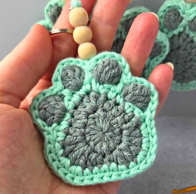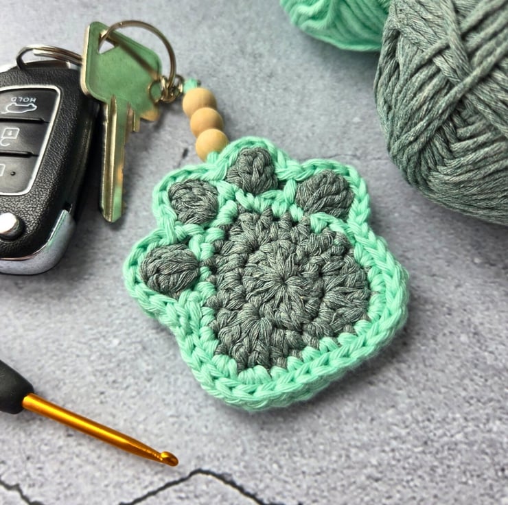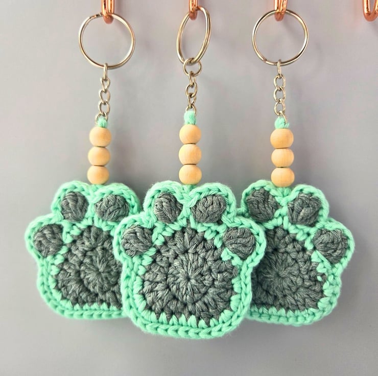 Carry a touch of cuteness everywhere you go with this handmade paw print keyring. Crocheted with quality cotton yarn in a beautifully coordinated colour palette of mint green & grey, this keychain is the perfect small gift for any pet lover and stands out on any bag, backpack, or set of keys.