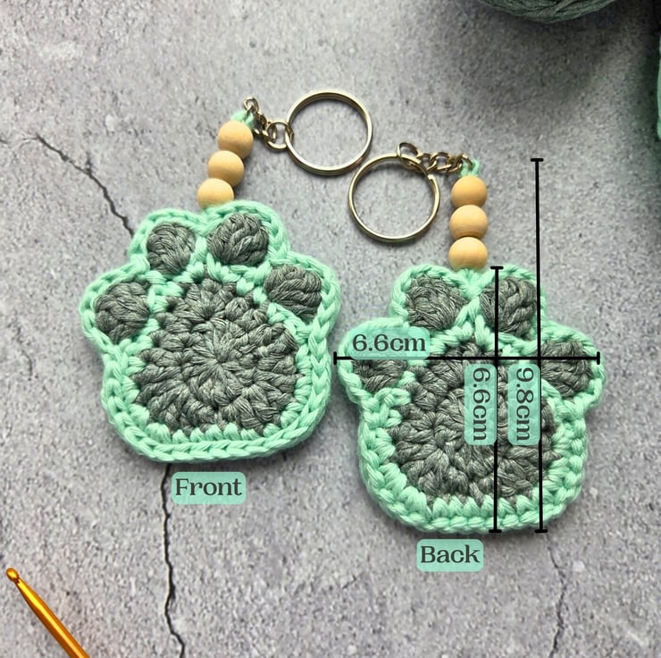 The keyring consists of the crocheted paw print, attached on a 25mm metal ring with connector chain. It is embellished at the top with three 10mm wooden beads in natural colour. The keyring is double sided and about 8mm thick. Please see pictures for the measurements.