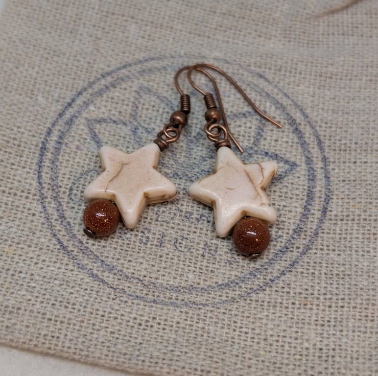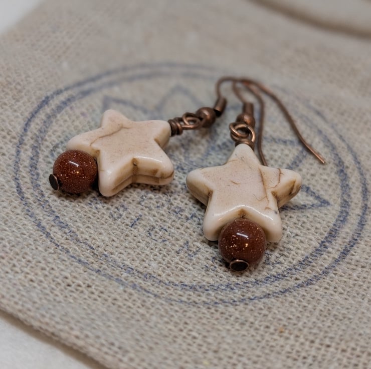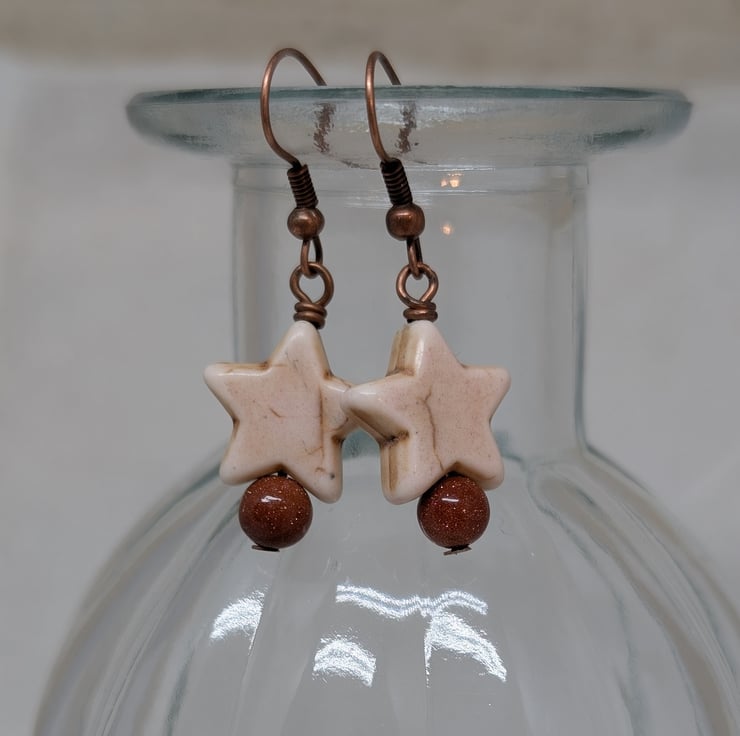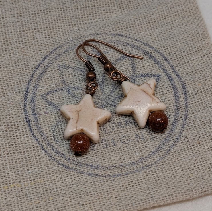 These simple earrings feature chunky howlite stars in a soft cream colour. Beneath them are shimmery round goldstone beads. They've been attached to copper ear wires to give an overall warm tone.