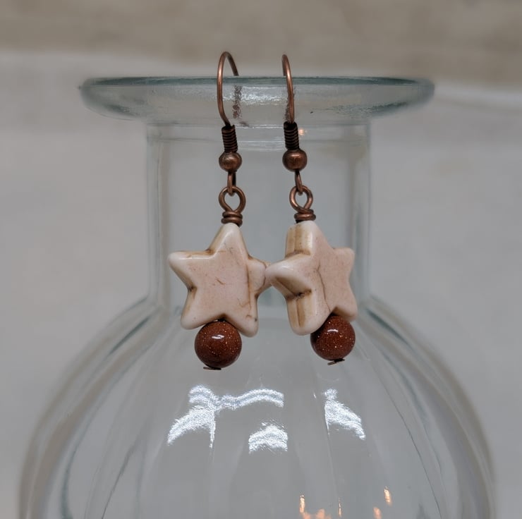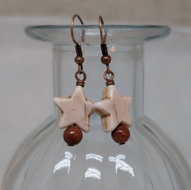 Cream howlite star and goldstone bead earrings with copper ear wires