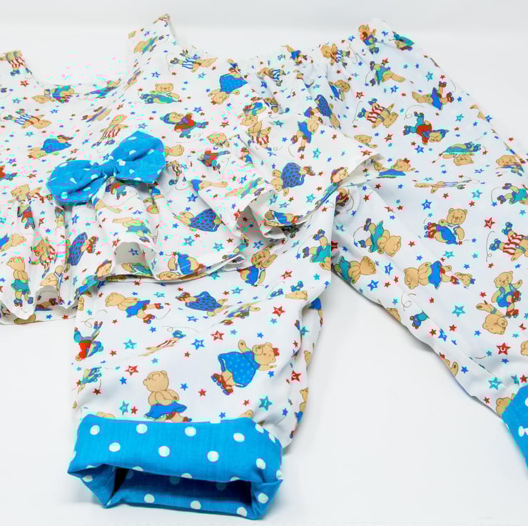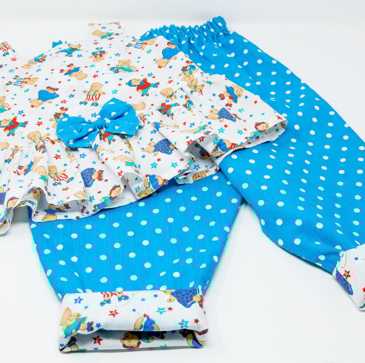 The matching trousers have an elasticated waist and can be reversed to turquoise with white spots to match the bow.