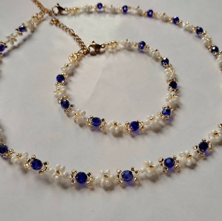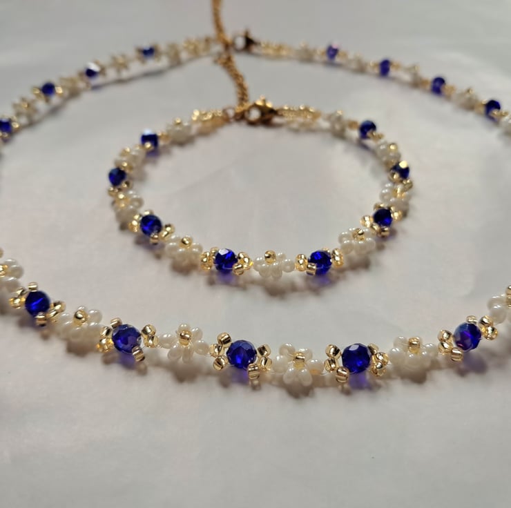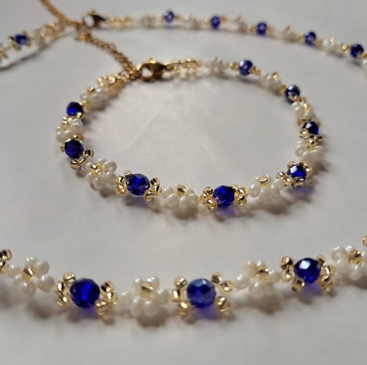 This handmade bracelet and necklace set features delicate white seed beads accented with deep sapphire-blue crystals and subtle gold-tone details. The contrast between the soft white beads and rich blue crystals creates an elegant, timeless look.