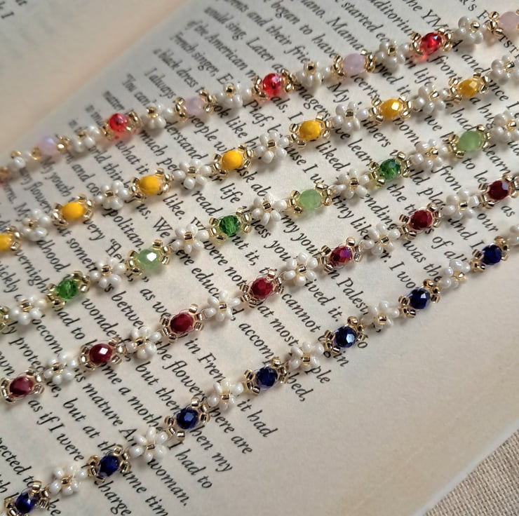 White seed beads with sapphire-blue crystal accents
