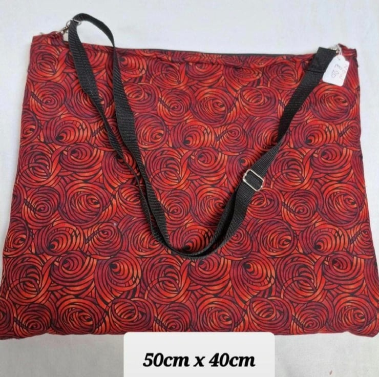A striking handmade tote bag designed to comfortably carry a laptop, books or everyday essentials. Made using 100% cotton fabric with a bold red and black spiral design, this bag is both practical and eye catching.