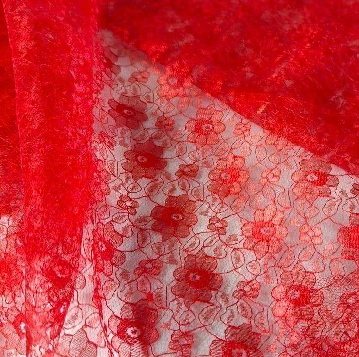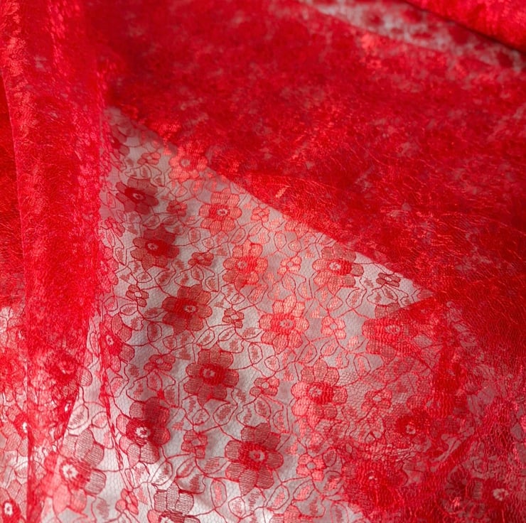 The fabric has a fine net structure with a floral pattern, making it ideal for clothing overlays, dancewear, costumes, accessories, soft furnishings, table décor, craft projects, or festive decorations.