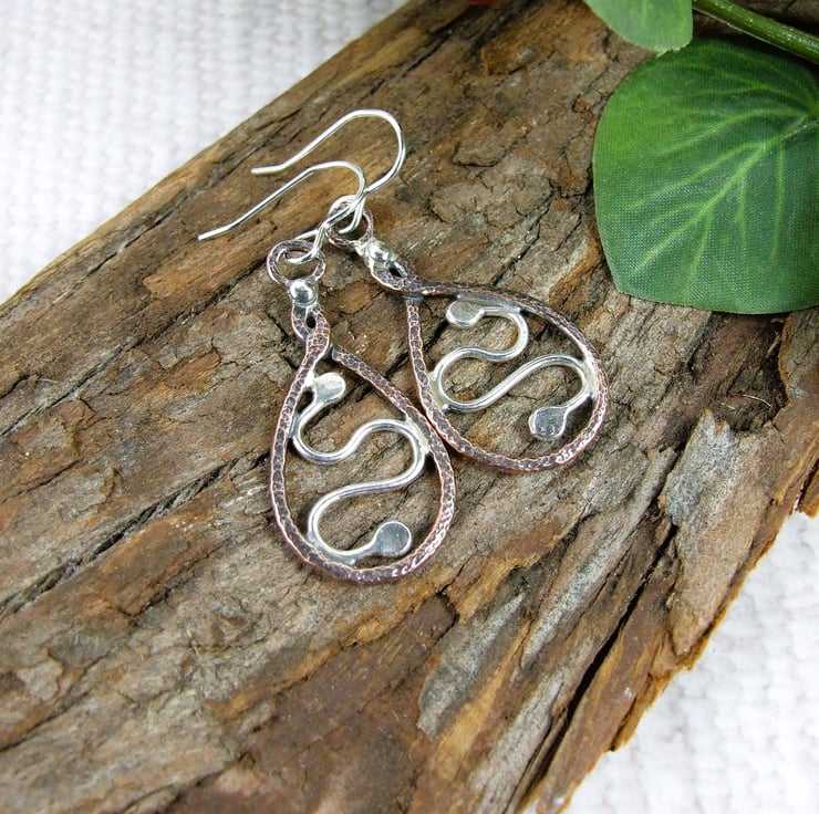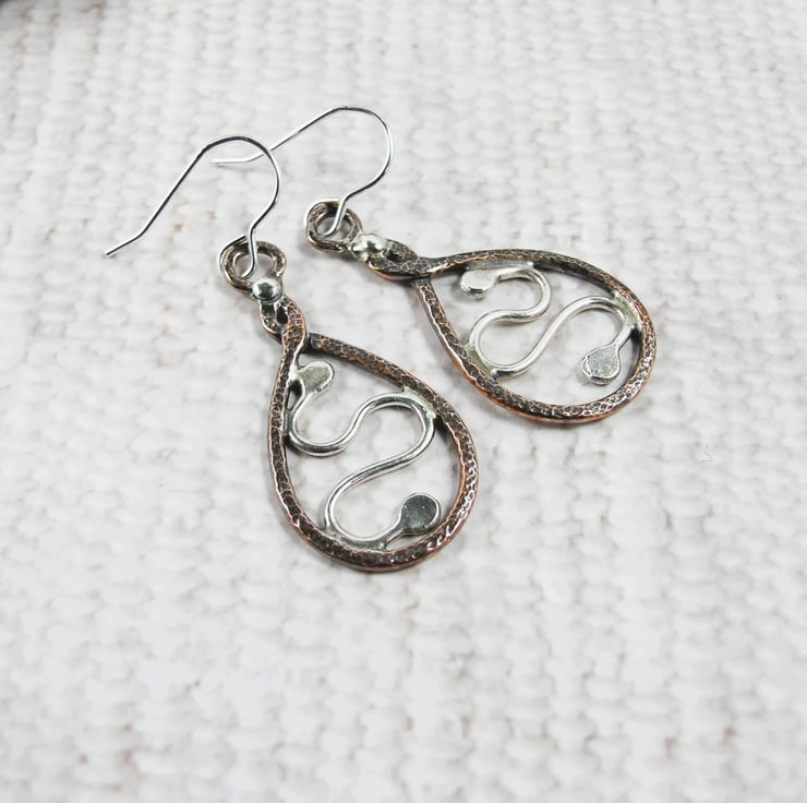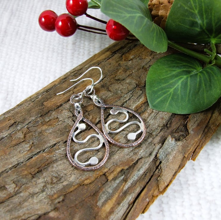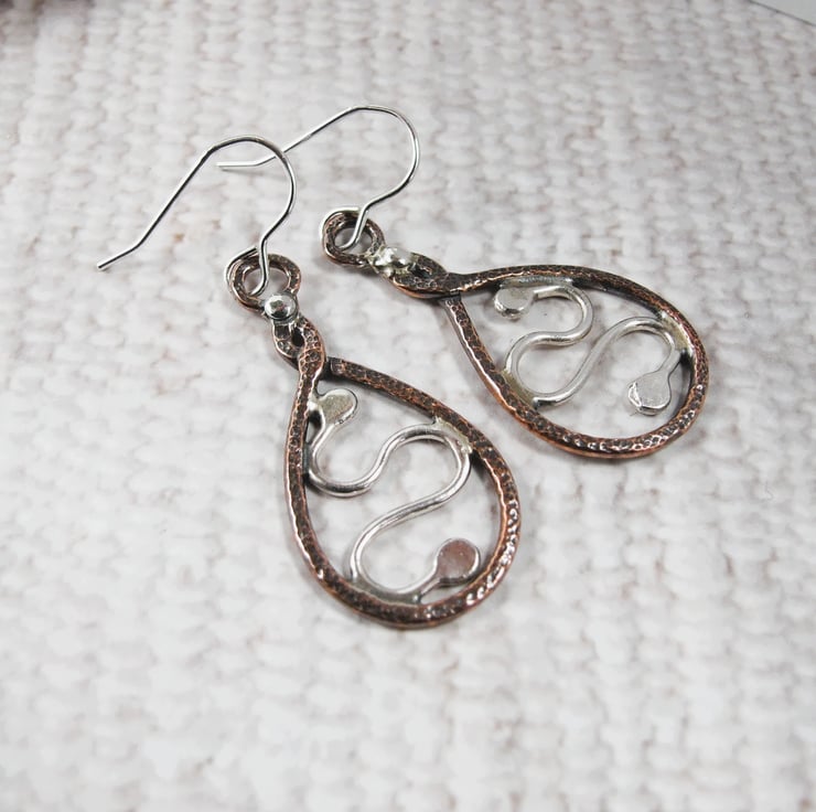 Sterling Silver and Copper Earrings. Teardrop shape with curved wire design centre, sterling silver ear wires.