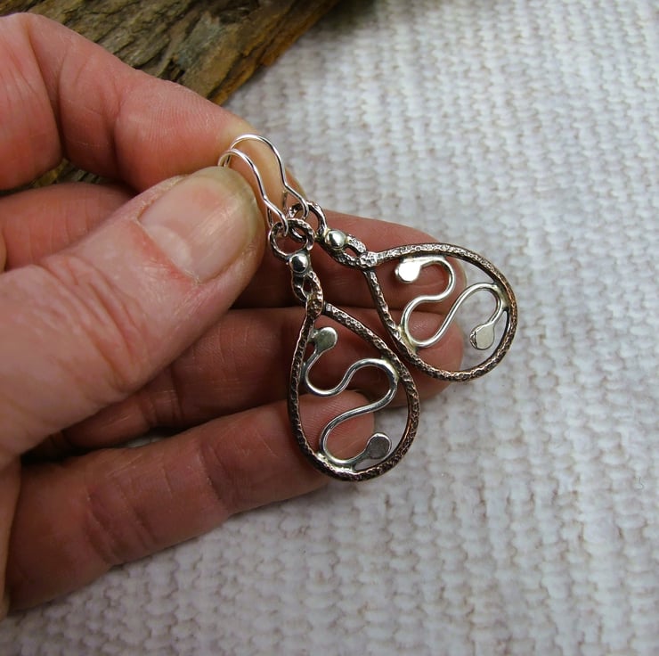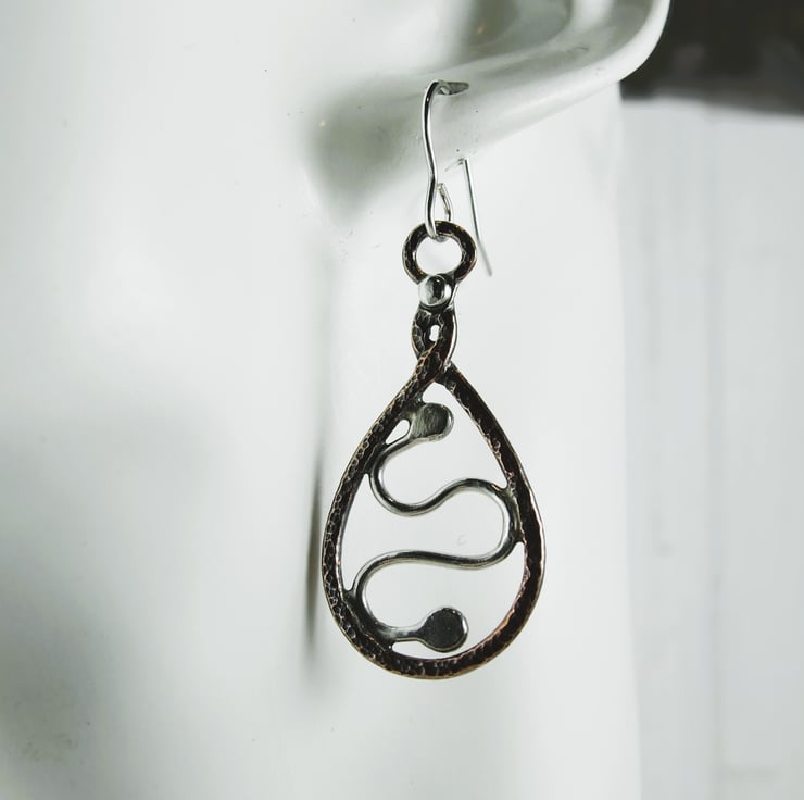 I have used 1.2mm copper wire and shaped into teardrops. For the inside of the teardrops I have used sterling silver wire and heated to melting point to create small beads either end and then curved, shaped and soldered inside the teardrops. Finished with sterling silver ear hooks