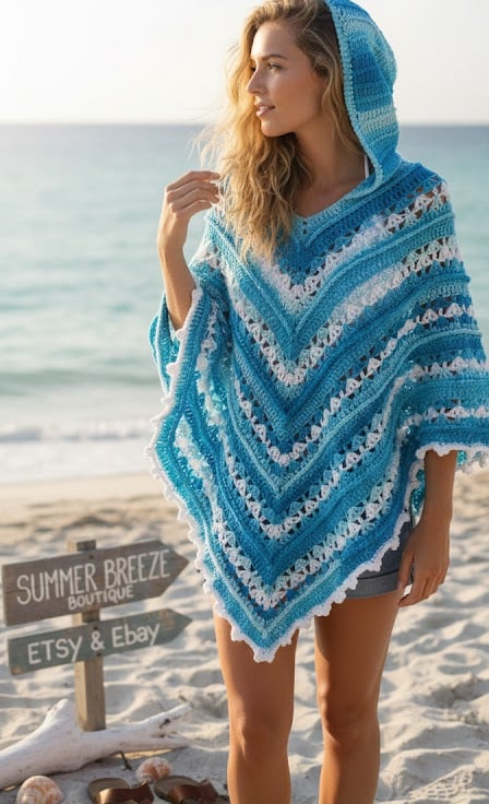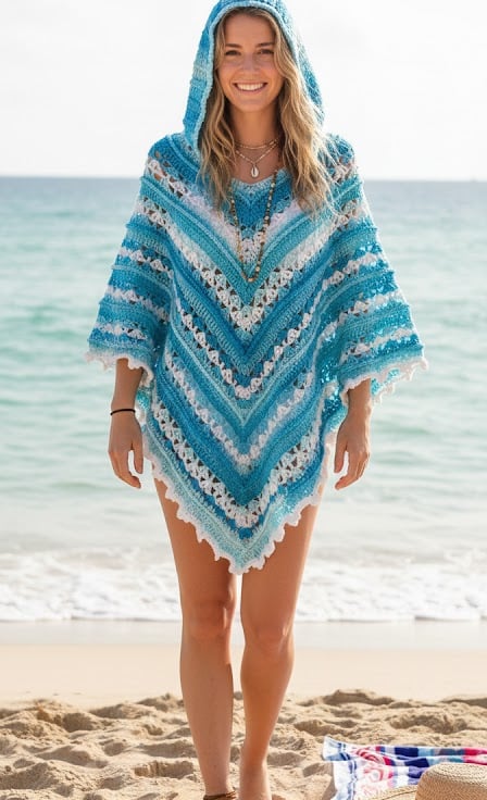 Crafted during quiet afternoons, this hooded poncho was inspired by the rhythmic colours of the coast—from deep ocean blues to the frothy white of breaking waves.