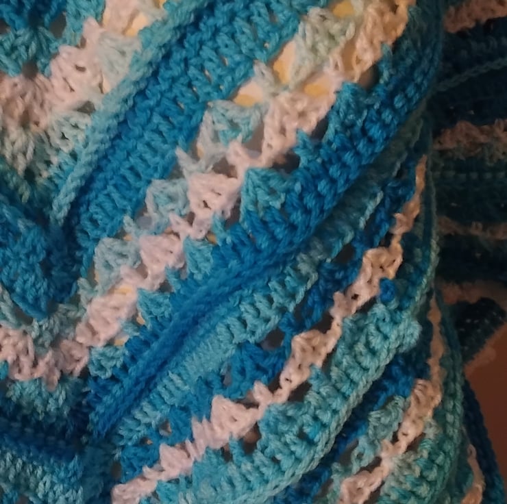Colourway: Multi-tonal blue ombre/variegated yarn with white accents.