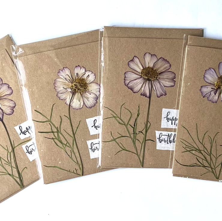 This lovingly handmade real pressed flower greeting card is made using cosmos grown from seed in our garden. With a hand printed message.