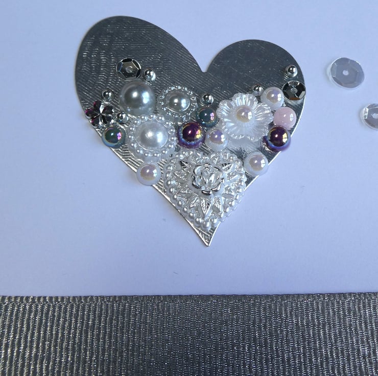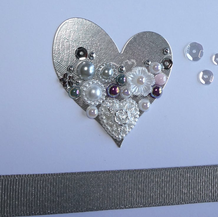 An embossed silver foiled heart has been die cut and embellished with sequins, faux pearls and flower beads in shades of white, silver and pink. It has been attached to bright white background card above a band of silver textured ribbon.