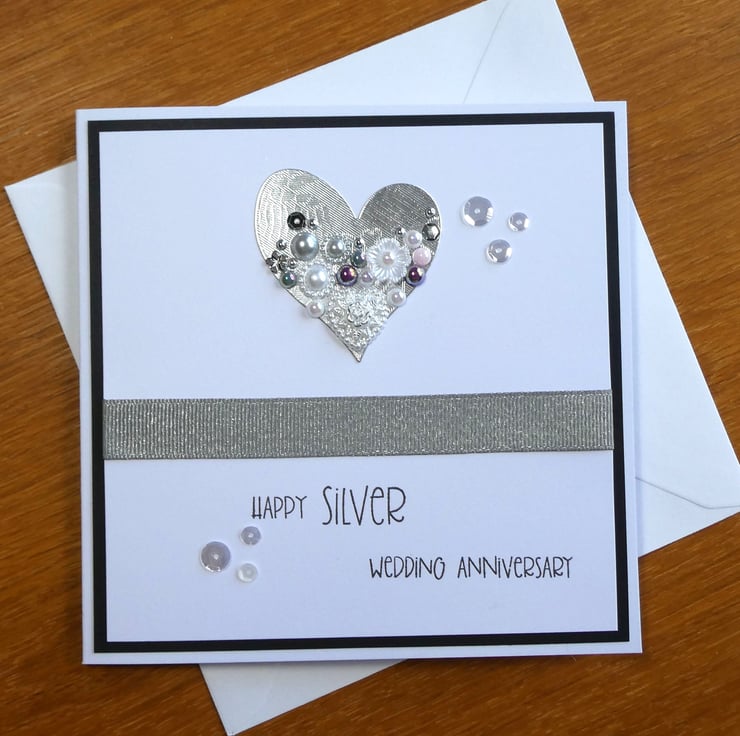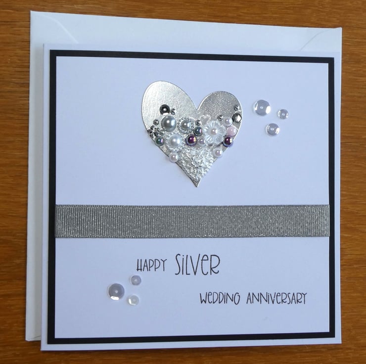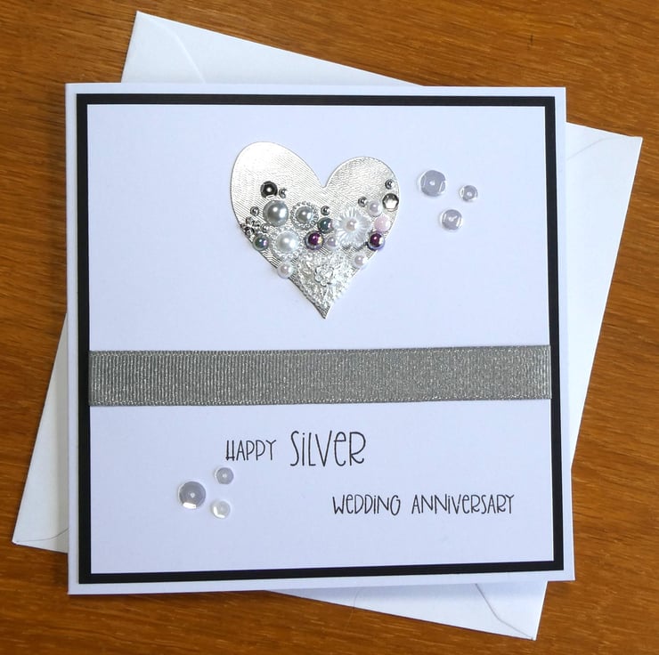 This elegant Silver Wedding Anniversary card has a silver foiled embellished heart and silver ribbon and is perfect to send to someone celebrating their 25th Wedding Anniversary.