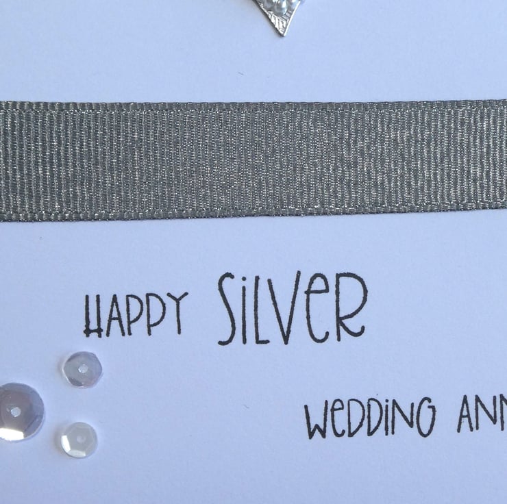 A scattering of clear, silver and white sequins has been added and the message Happy Silver Wedding Anniversary has been stamped in black archival ink to complete the design.