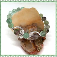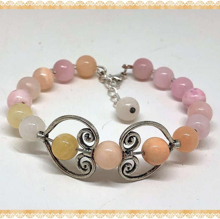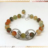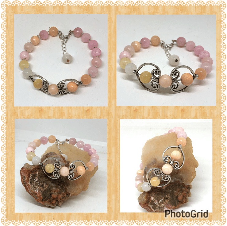 Created using these 8 mm multicoloured jade gemstone beads, threaded onto stainless steel memory wire to form a bangle style bracelet, I’ve add 2 heart connectors, each with an fidget spinner jade bead, a lobster clasp with extension chain.