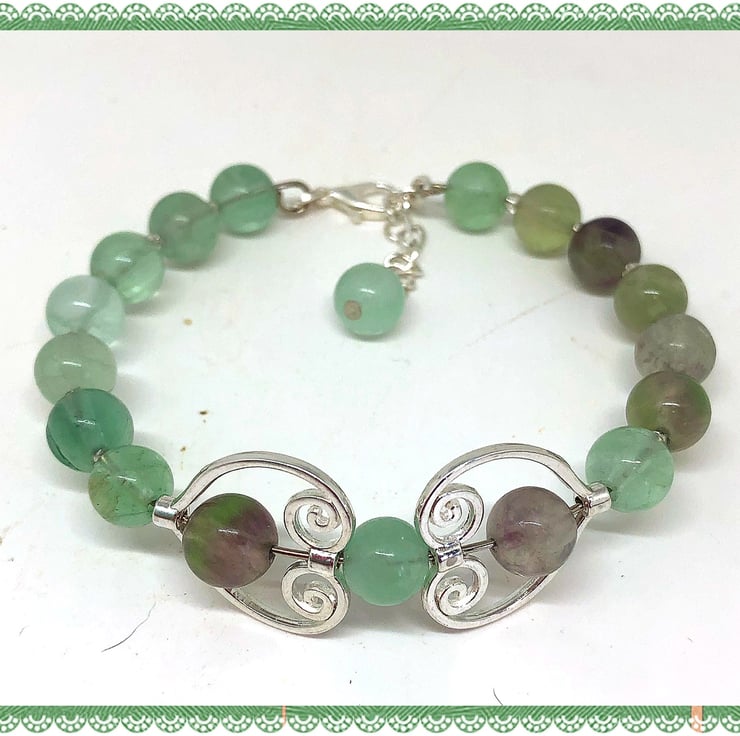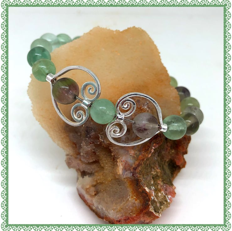 Created using these 8 mm Fluorite gemstone beads, threaded onto stainless steel memory wire to form a bangle style bracelet, I’ve add 2 heart connectors, each with an fidget spinner Fluorite agate bead, a lobster clasp with extension chain.
