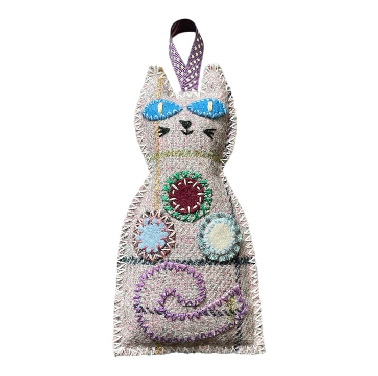 This hand stitched and hand embroidered Tweedie Katz is a house decoration that may be hung up (there is a small ribbon loop at the top of the Tweedie Katz ) or just placed creatively around the home. It is filled with dried Lavender. The Tweedie Katz measures 18cm from the top to the bottom and is 9 cm across the widest part. Dust clean with a dry cloth.THIS IS NOT A TOY.