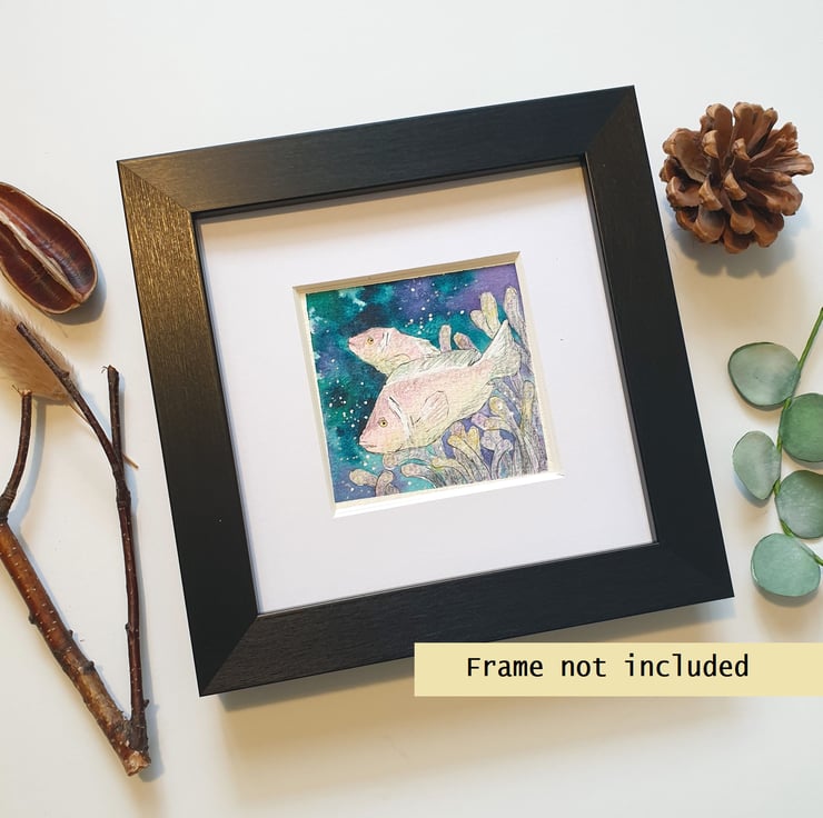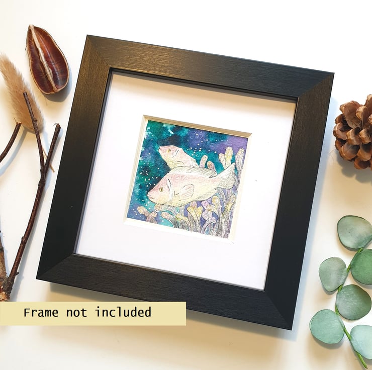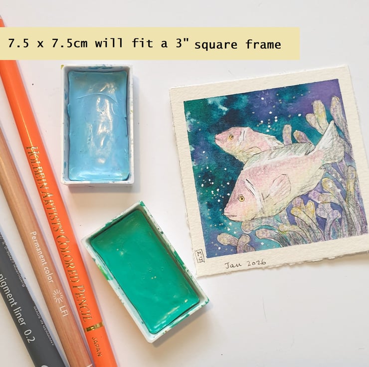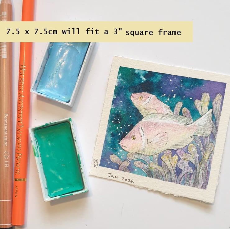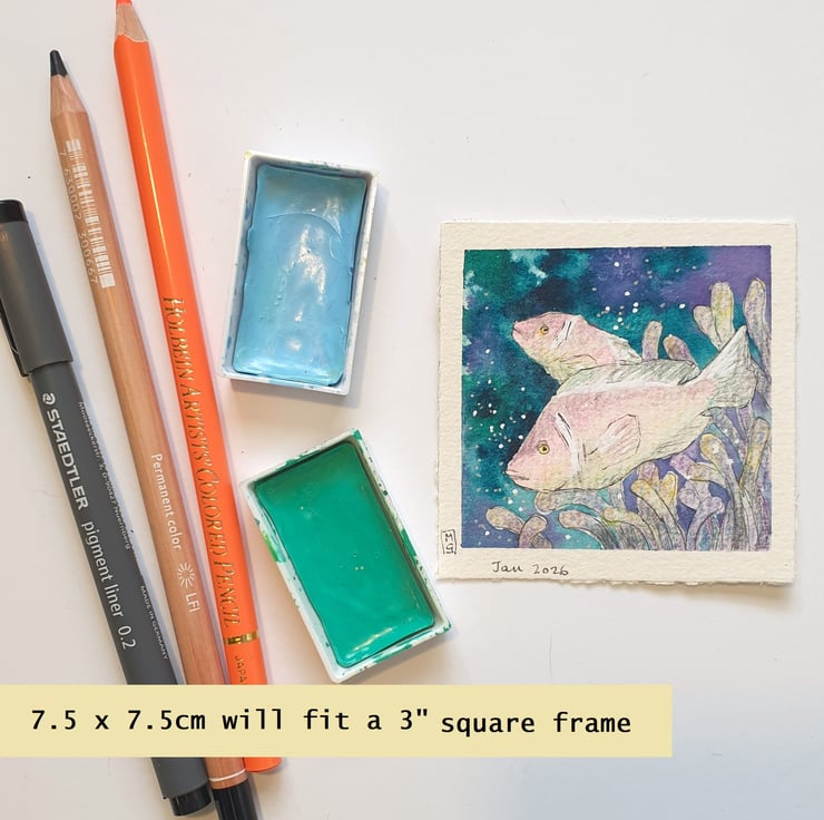 A tiny painting of pale pink anemone fish with a dark ocean background.