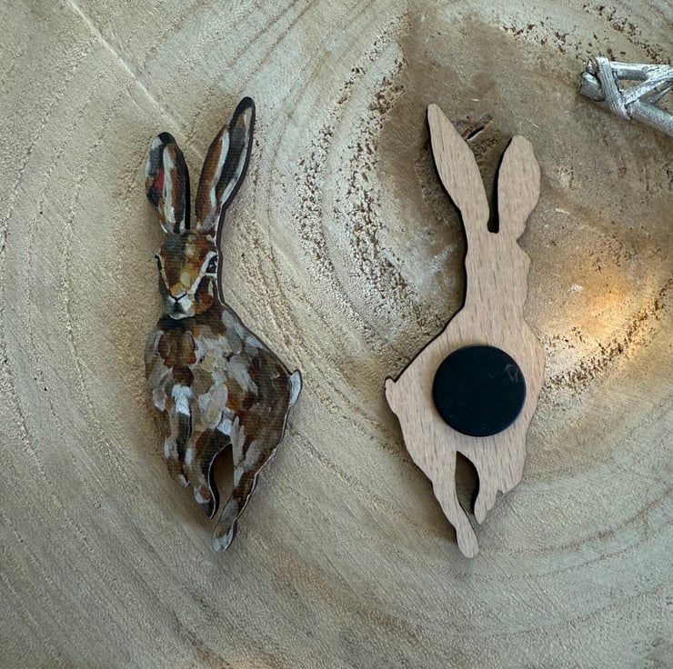 Hare has been uv printed onto fcs certified wood and laser cut around the shape of the animal. String magnet is secured the reverse.